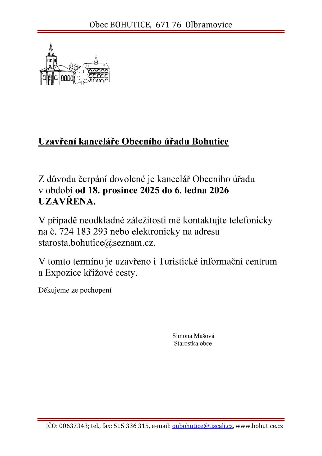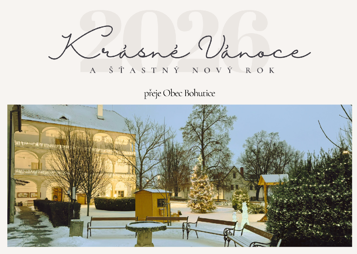 V období od 18. 12. 2025 do 6. 1. 2026 je uzavřena kancelář OÚ Bohutice, Turistické informační centrum a Expozice křížové cesty.